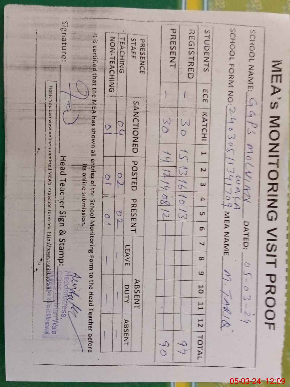 | Attendance Register | Head Teacher | MEA with School | Visit Proof |