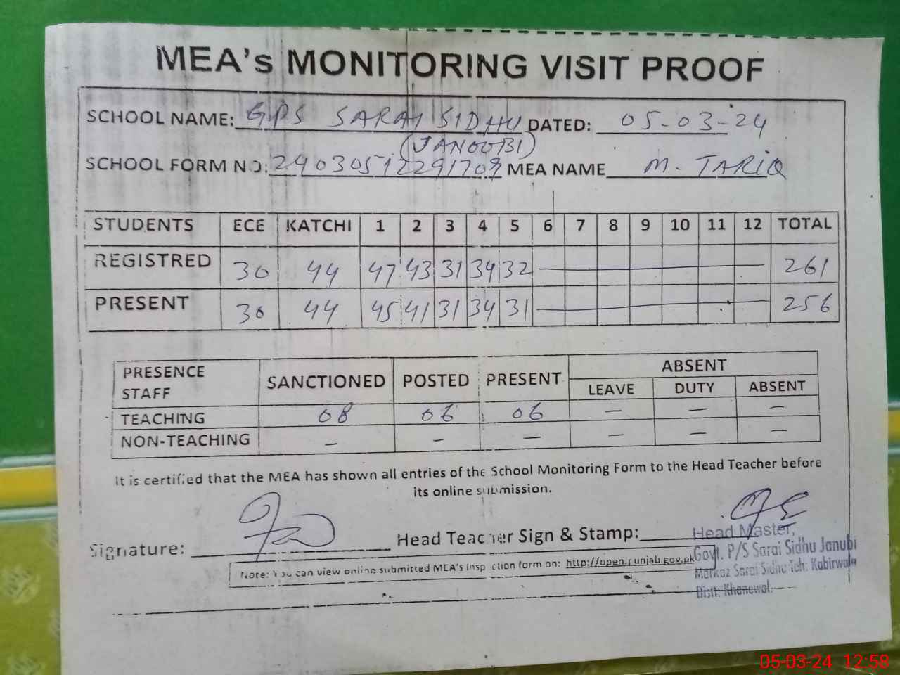 | EMIS Code: 36410230 | Name of School: GPS SARAI SIDHU JANUBI, SARAI SIDHU | |||