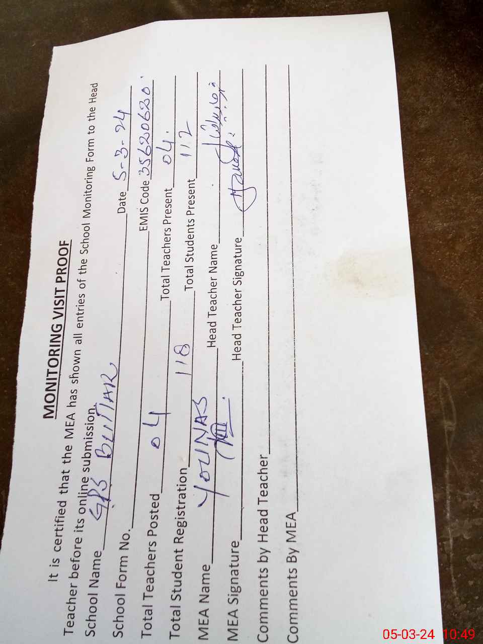 | Attendance Register | Head Teacher | MEA with School | Visit Proof |