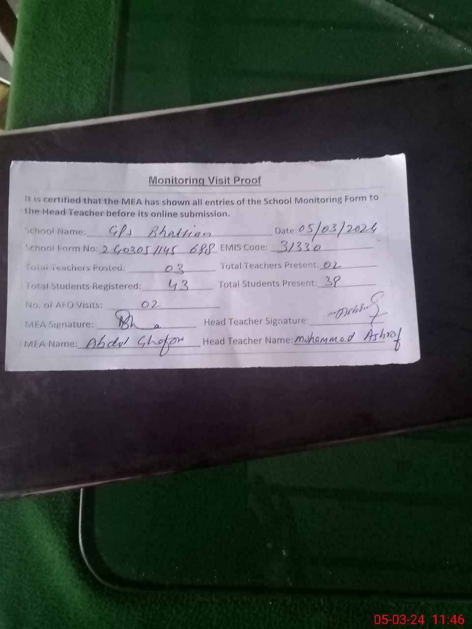 | Attendance Register | Head Teacher | MEA with School | Visit Proof |