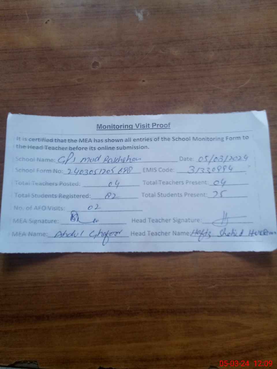 | Attendance Register | Head Teacher | MEA with School | Visit Proof |