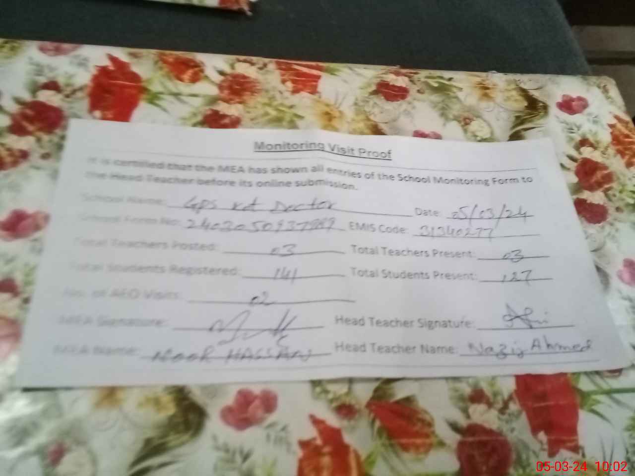 | Attendance Register | Head Teacher | MEA with School | Visit Proof |