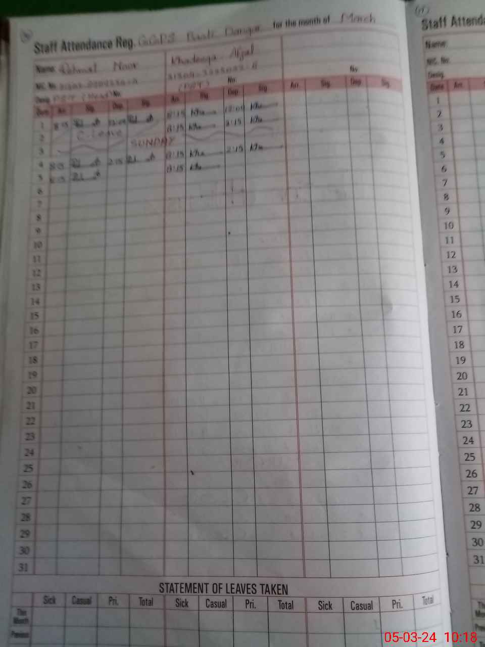 | CNIC | Full Name | Designation | R/C | Absence During Last Calender Month |