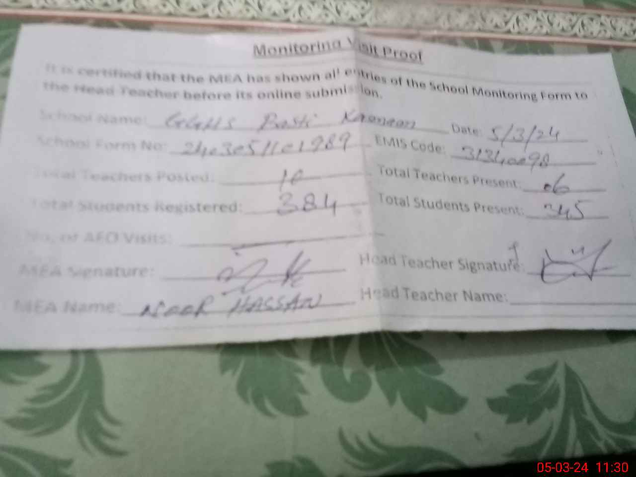 | Attendance Register | Head Teacher | MEA with School | Visit Proof |