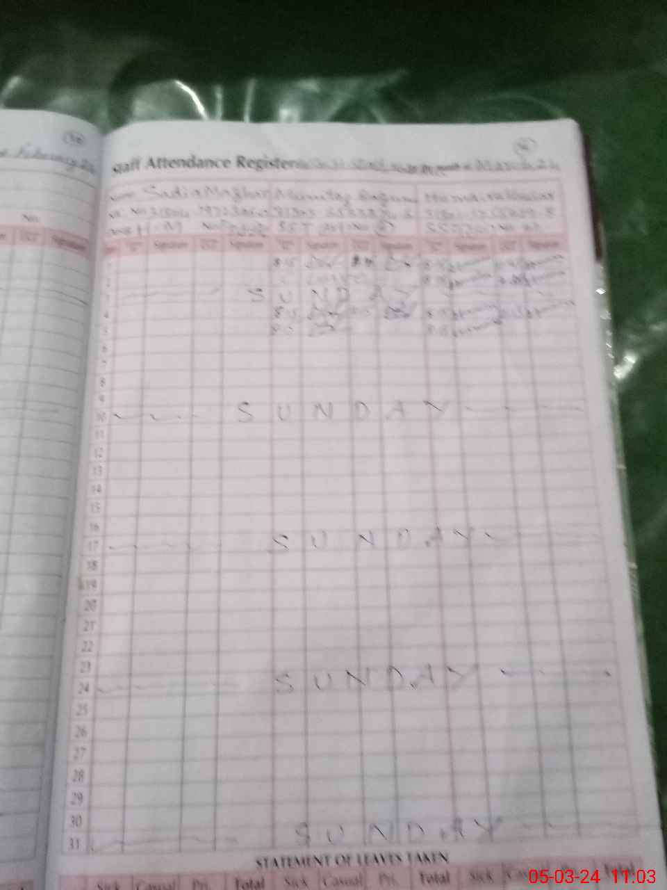 | 31**** | Sa**** Pa**** | 1 | 0 | 0 | 29 | 0 | 0 | 0 | 0 | 0 | 0 | Absent (Un-Authorized) | |