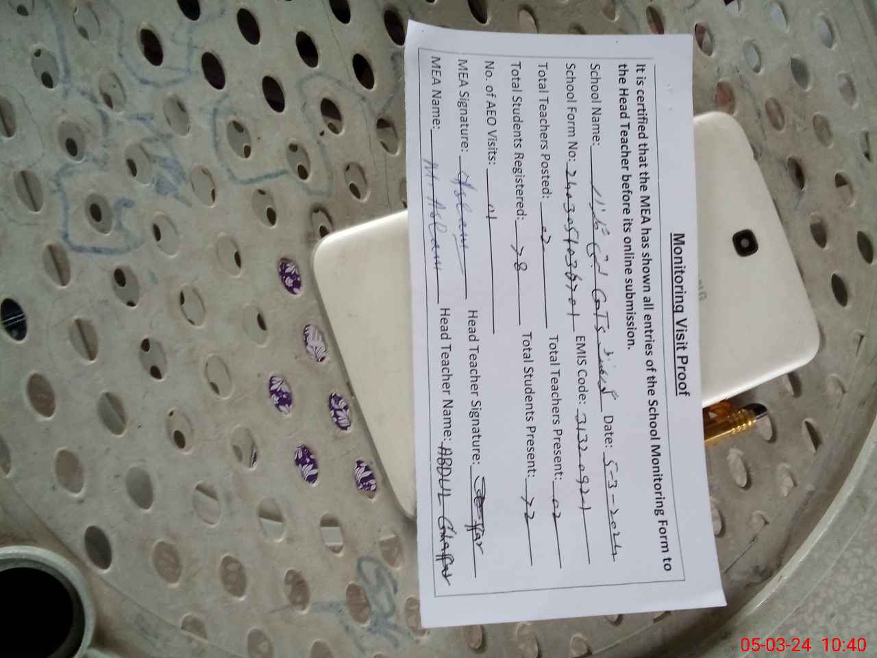 | Name: AB**** GH**** Designation: (School Headmaster's/Headmistress's) PST/PTC/JV Phone/Cell Number: 03**** |