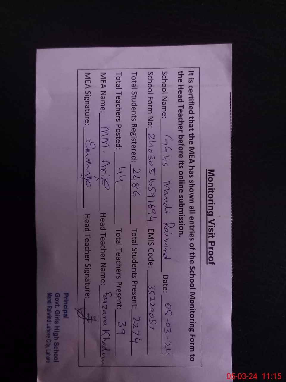 | EMIS Code: 35220057 | Name of School: GGHS MANDI RAIWIND | |||