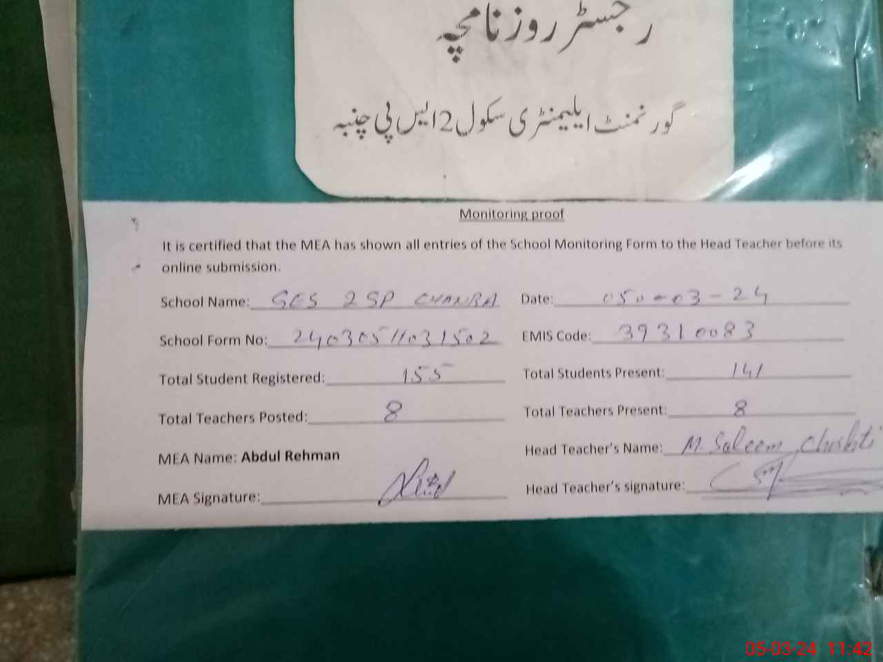 | Attendance Register | Head Teacher | MEA with School | Visit Proof |