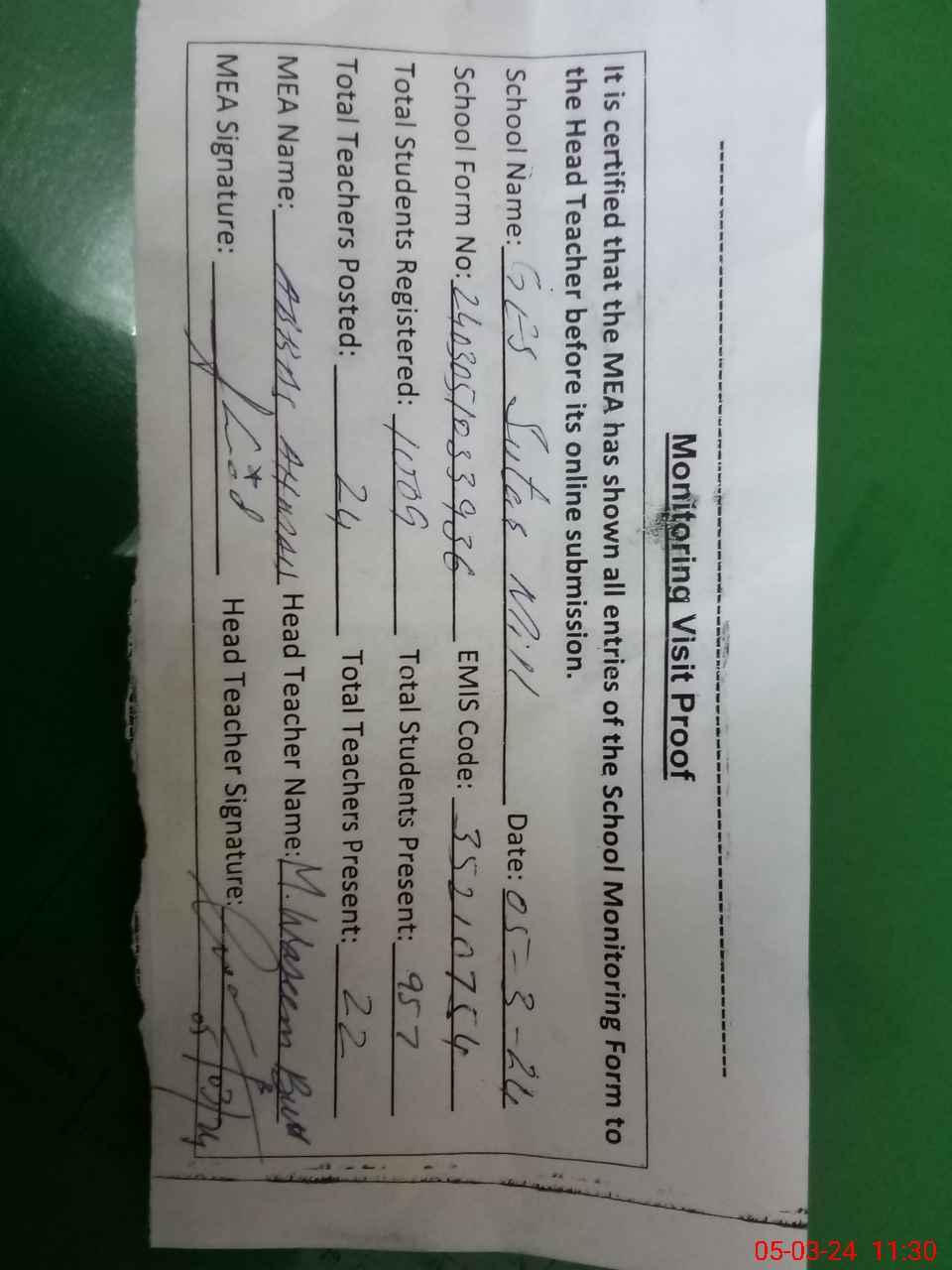 | Attendance Register | Head Teacher | MEA with School | Visit Proof |