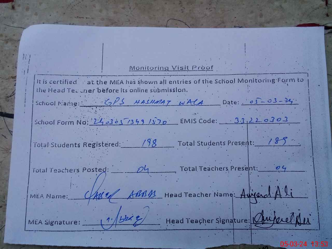 | EMIS Code: 33220303 | Name of School: GPS HASHMAT WALA | |||