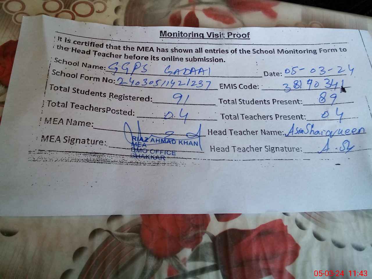 | Attendance Register | Head Teacher | MEA with School | Visit Proof |