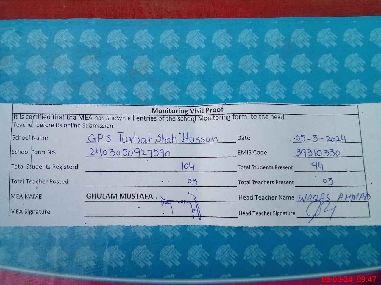 | Attendance Register | Head Teacher | MEA with School | Visit Proof |