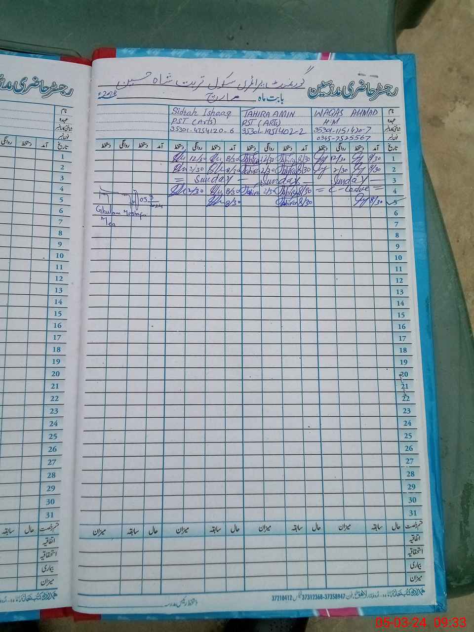 | Name: SI**** IS**** Designation: (School Headmaster's/Headmistress's) PST Phone/Cell Number: 03**** |