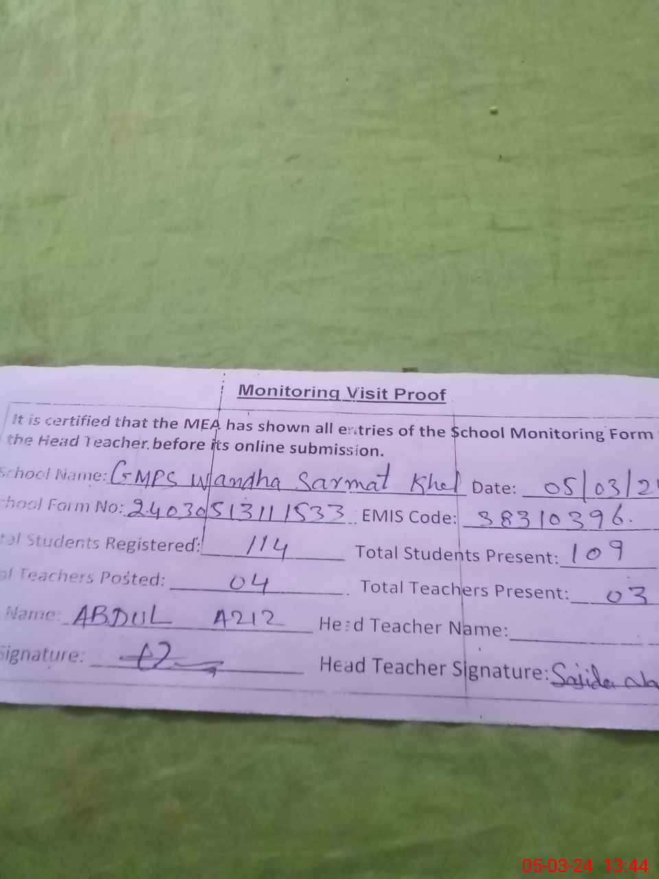 | Attendance Register | Head Teacher | MEA with School | Visit Proof |