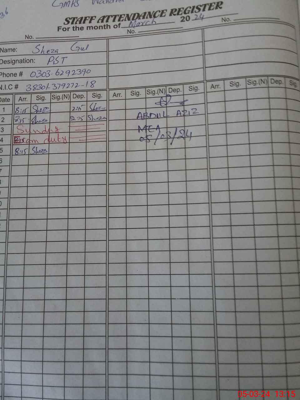 | CNIC | Full Name | Designation | R/C | Absence During Last Calender Month |
