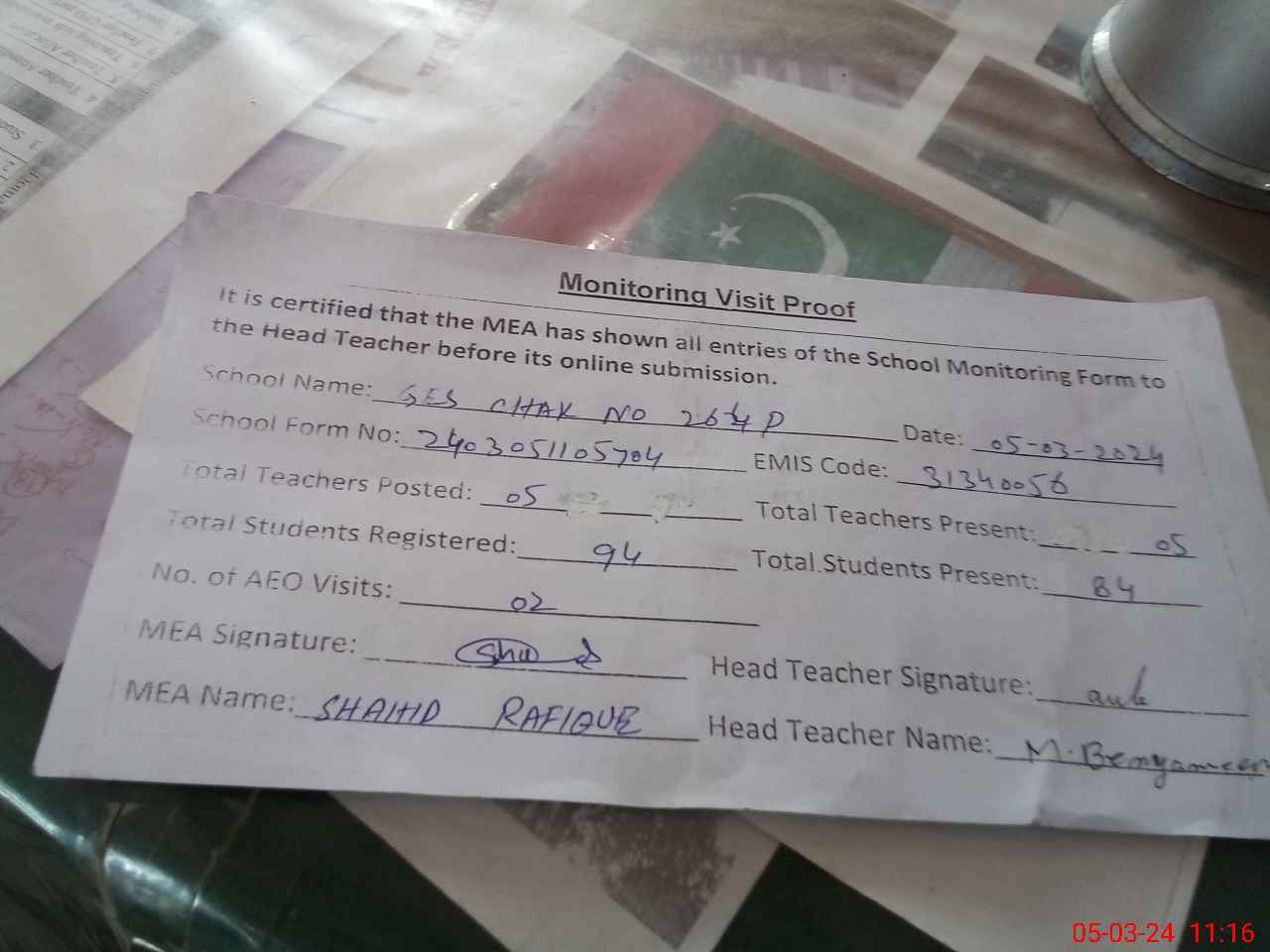 | Attendance Register | Head Teacher | MEA with School | Visit Proof |