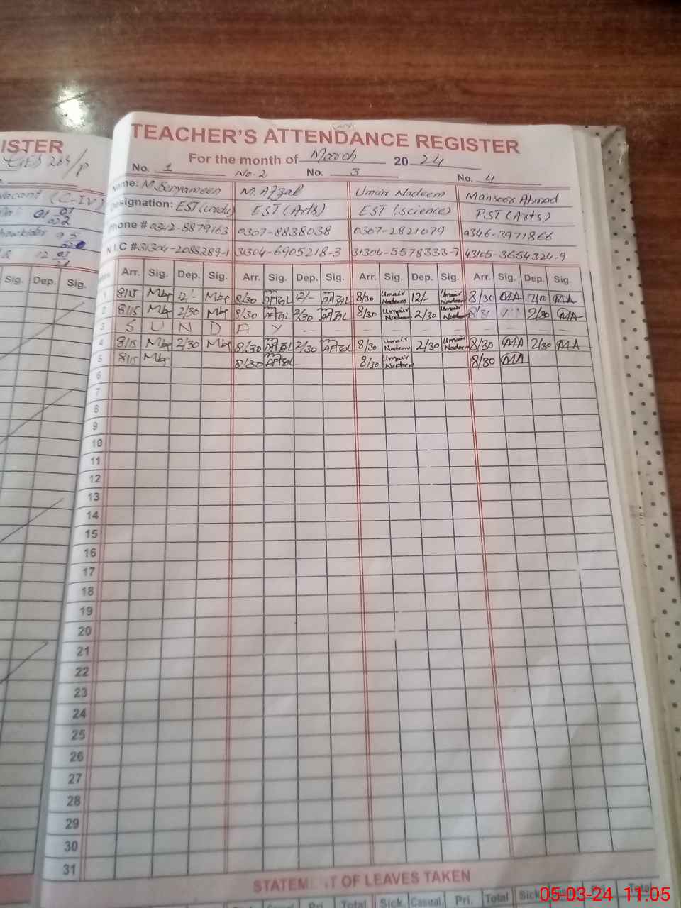 | CNIC | Full Name | Designation | R/C | Absence During Last Calender Month |