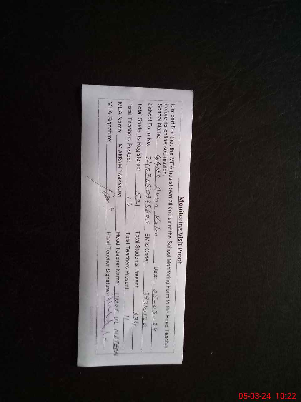 | Monitoring Date: 05-03-2024 | Start Time: 05-03-2024 09:35 AM | End Time: 05-03-2024 10:24 AM | Name of MEA: MU**** AK**** TA**** | |