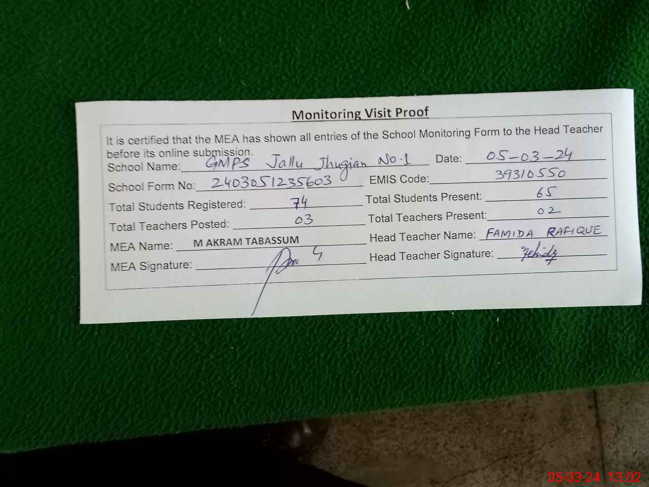 | Attendance Register | Head Teacher | MEA with School | Visit Proof |