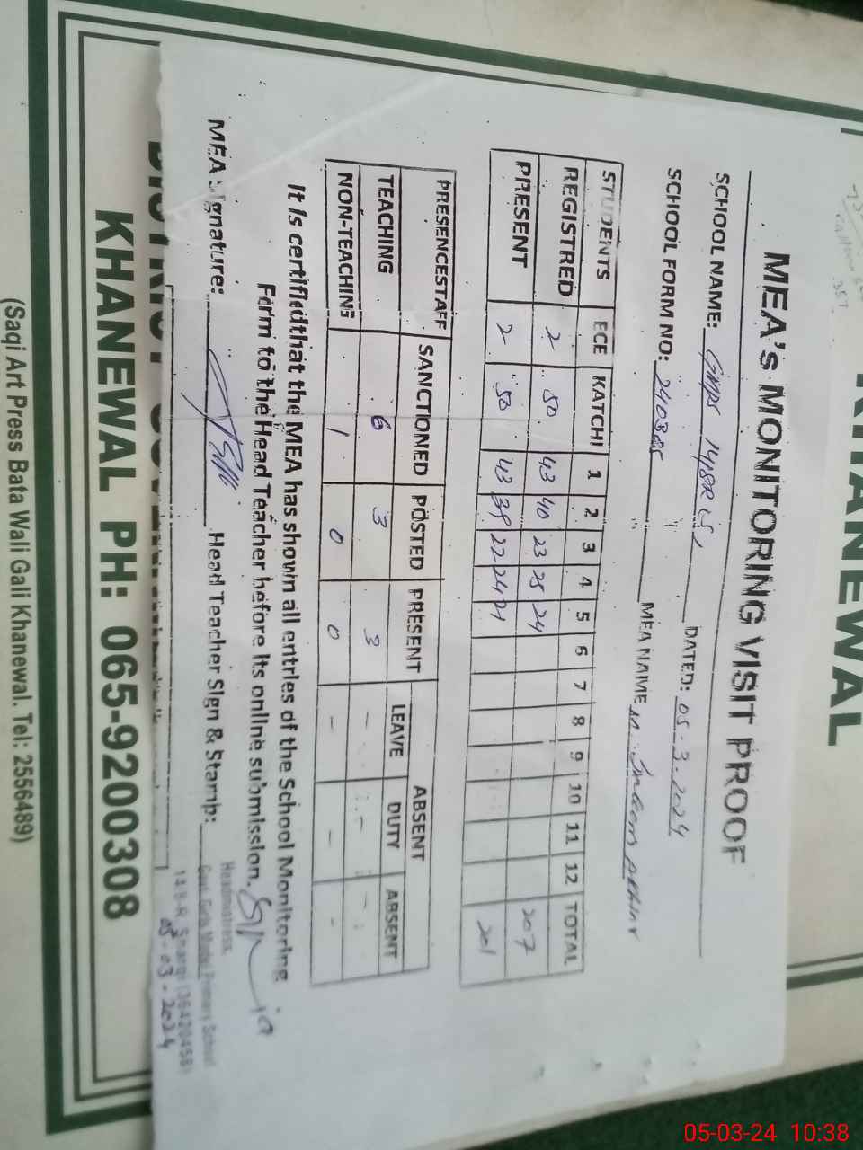 | Certified that this School was Inspected by the Undersigned MEA/DMO Today and the Information Stated Above is as Per Record. | |||||