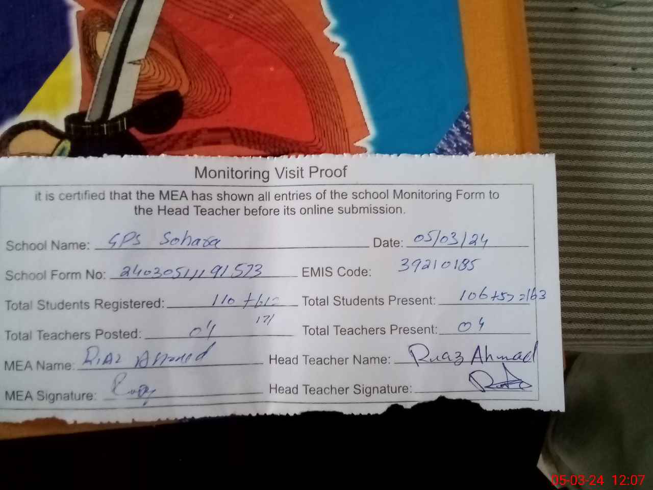 | Attendance Register | Head Teacher | MEA with School | Visit Proof |