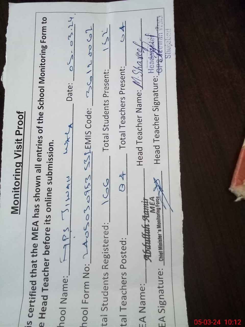| Attendance Register | Head Teacher | MEA with School | Visit Proof |