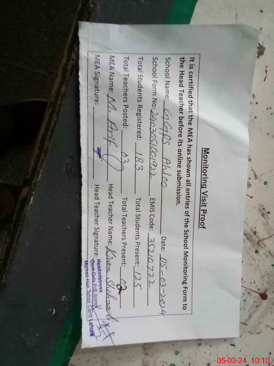 | Attendance Register | Head Teacher | MEA with School | Visit Proof |