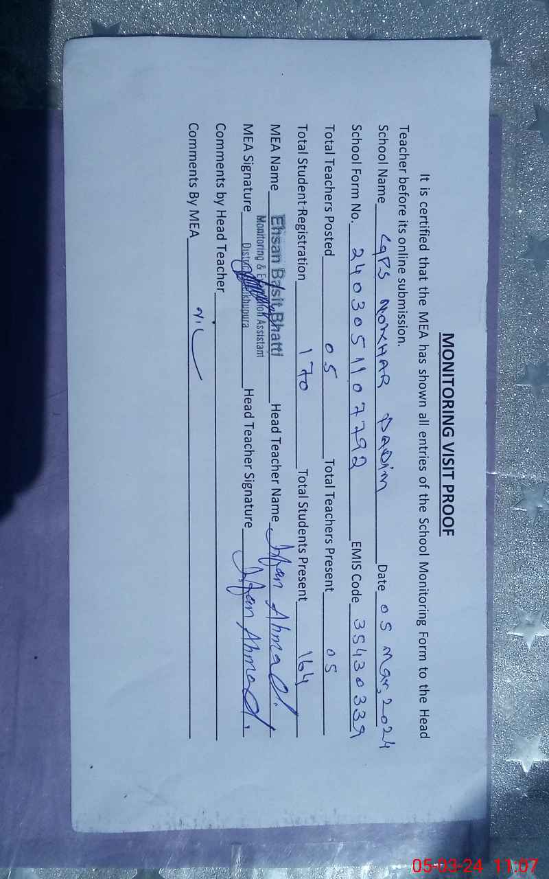 | Certified that this School was Inspected by the Undersigned MEA/DMO Today and the Information Stated Above is as Per Record. | |||||