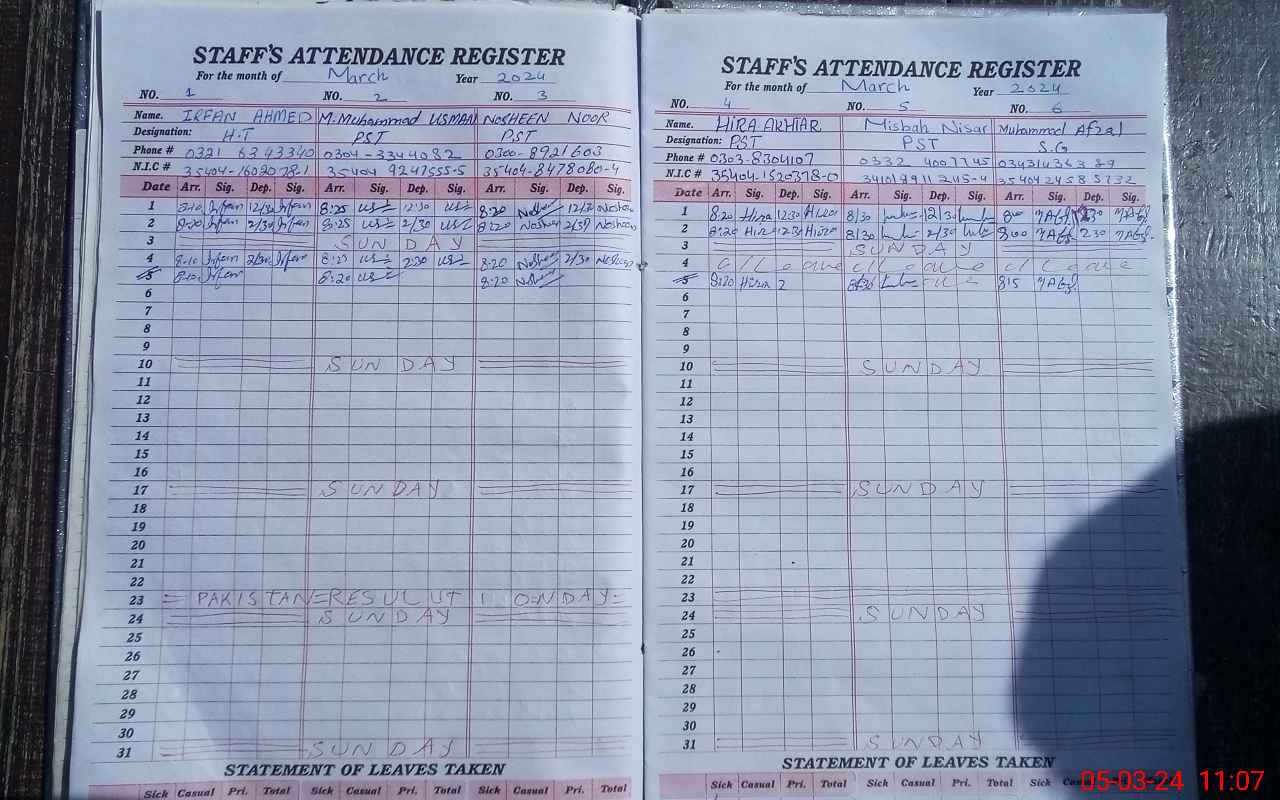 | Name: IR**** AH**** Designation: (School Headmaster's/Headmistress's) PST Phone/Cell Number: 03**** |