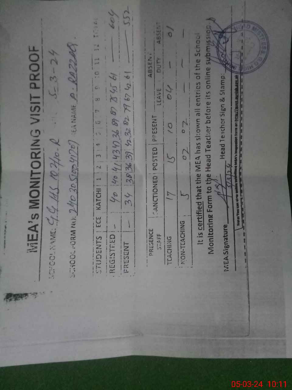 | Attendance Register | Head Teacher | MEA with School | Visit Proof |