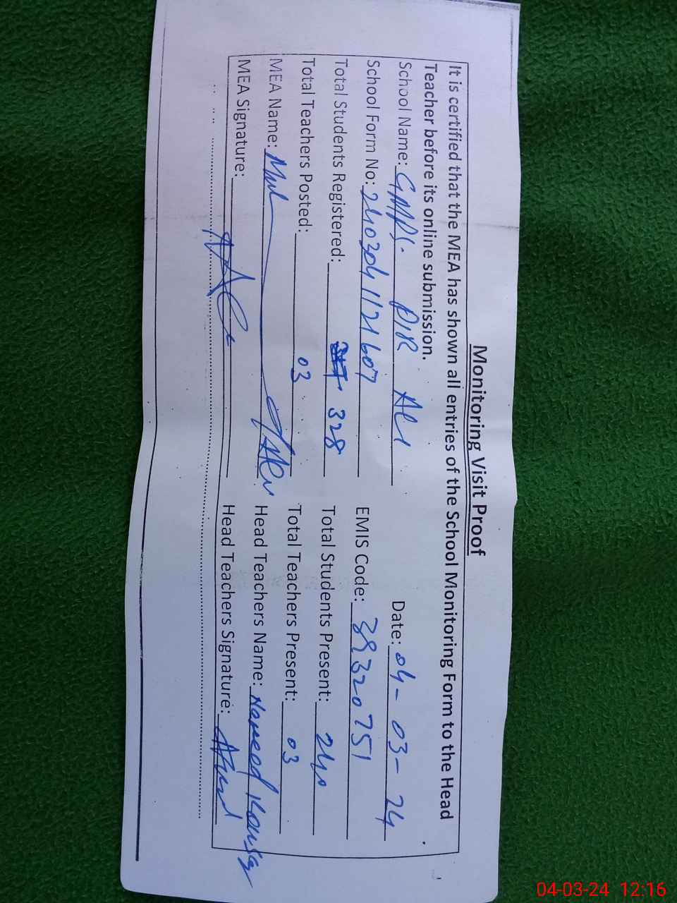 | Attendance Register | Head Teacher | MEA with School | Visit Proof |