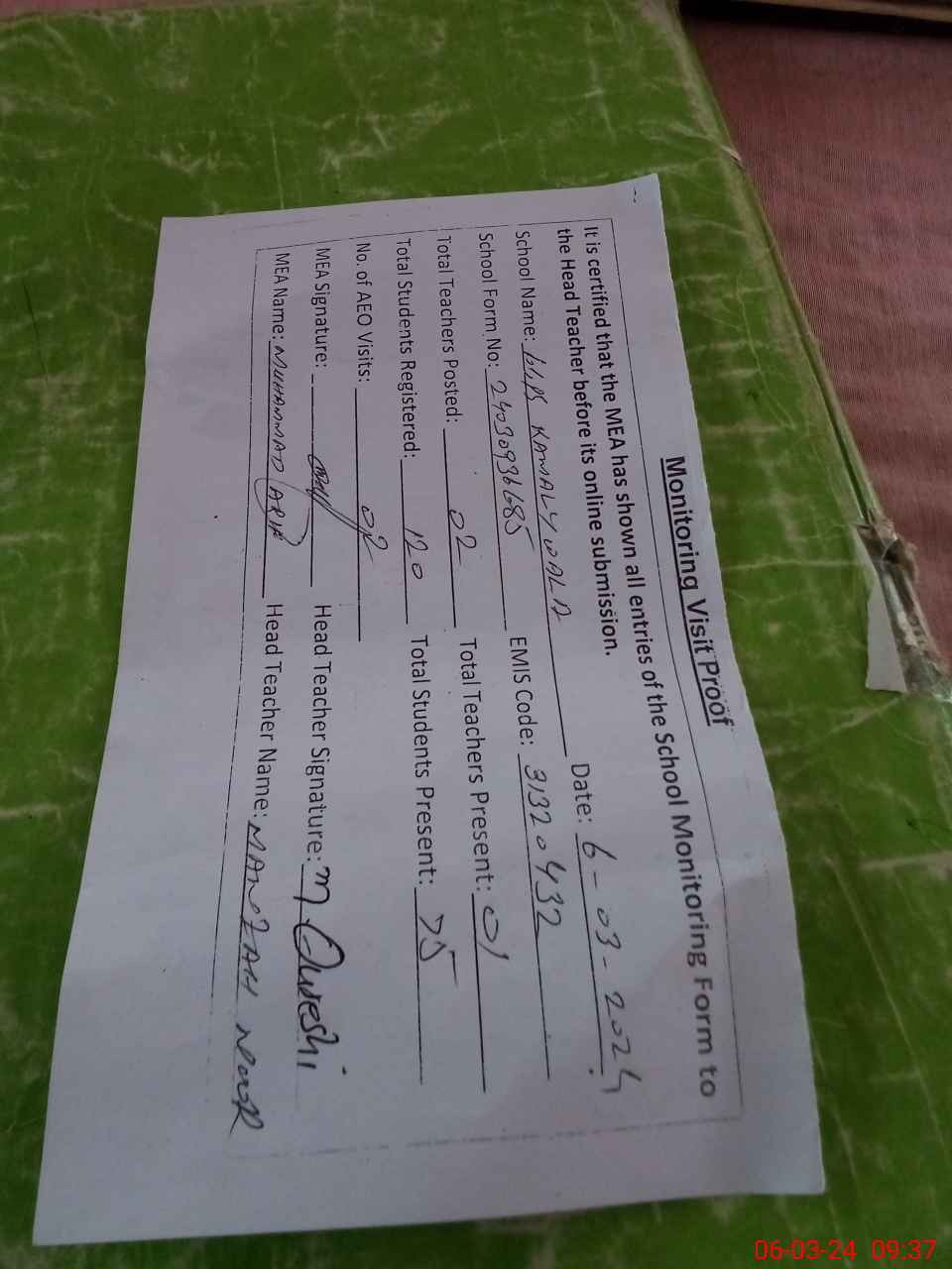 | Attendance Register | Head Teacher | MEA with School | Visit Proof |