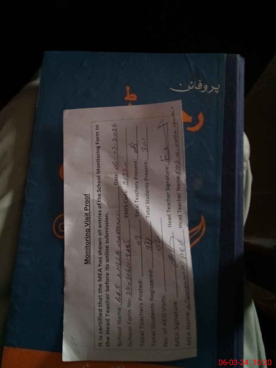 | Attendance Register | Head Teacher | MEA with School | Visit Proof |