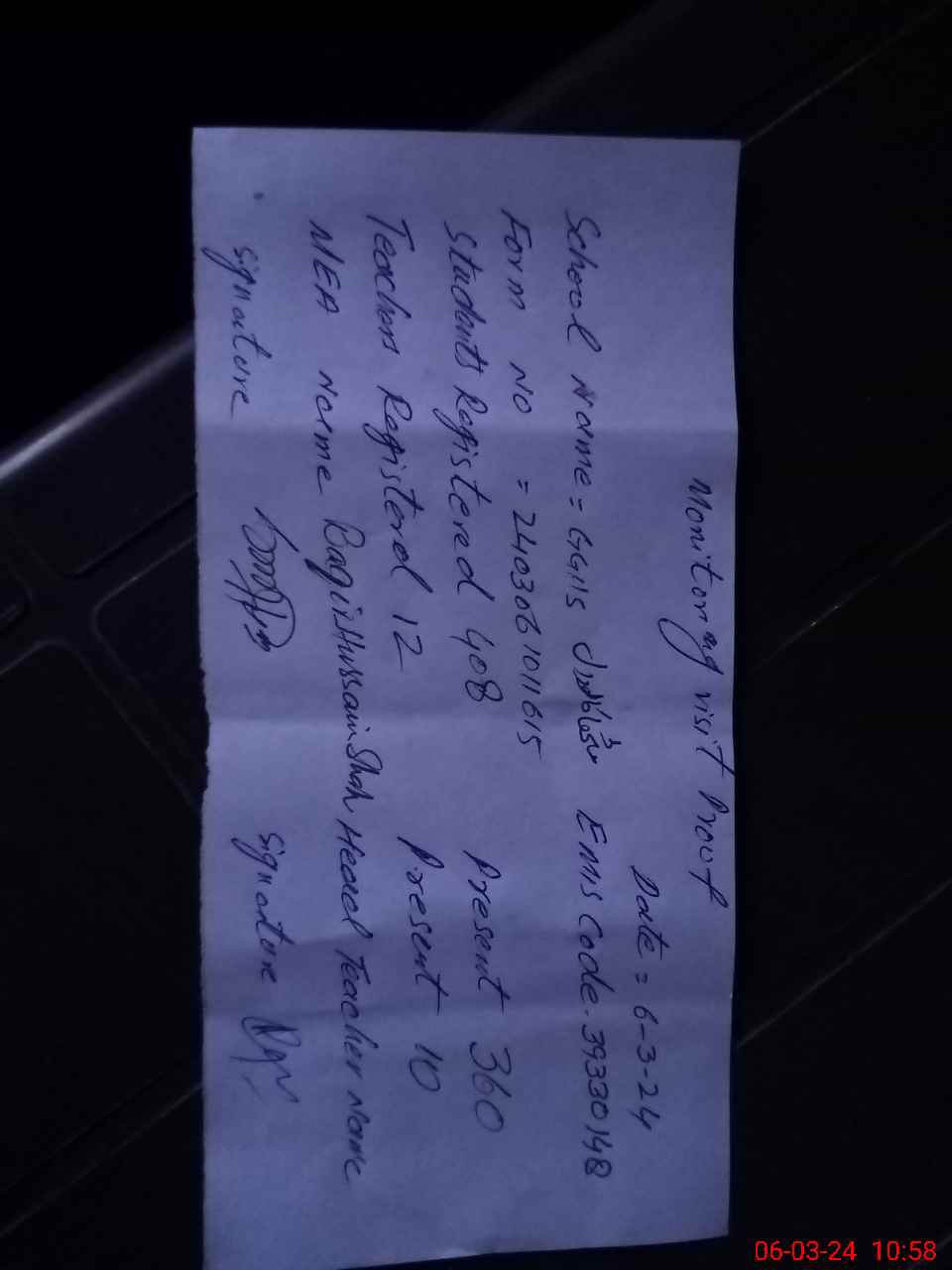 | Name: Az**** Yo**** Bh**** Designation: (School Headmaster's/Headmistress's) SSE IN charge Phone/Cell Number: 03**** |