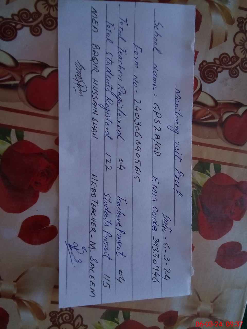 | Attendance Register | Head Teacher | MEA with School | Visit Proof |