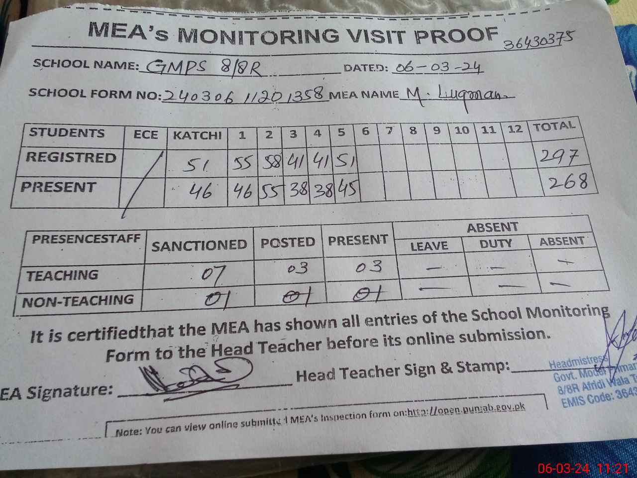 | Certified that this School was Inspected by the Undersigned MEA/DMO Today and the Information Stated Above is as Per Record. | |||||