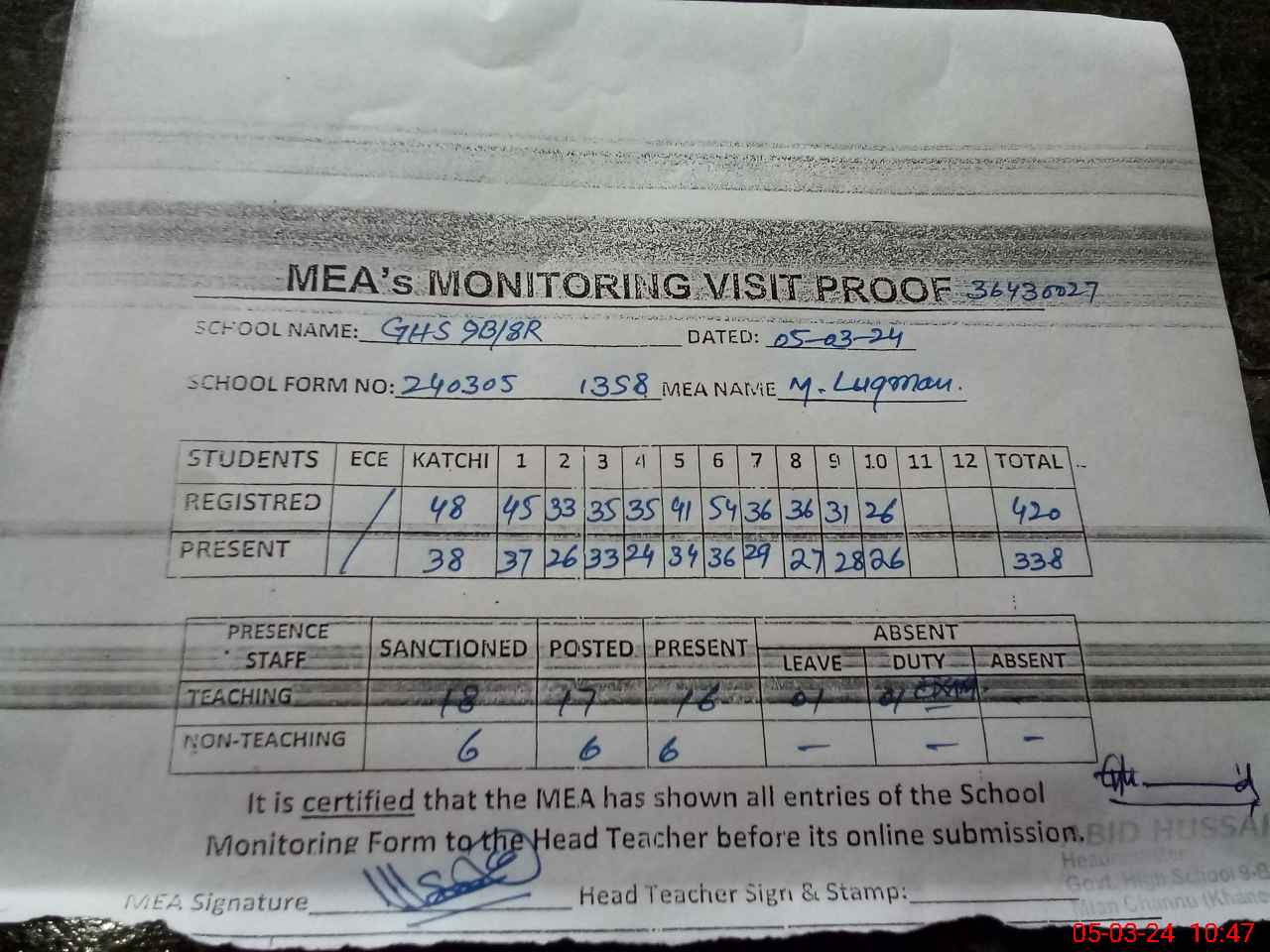 | Attendance Register | Head Teacher | MEA with School | Visit Proof |