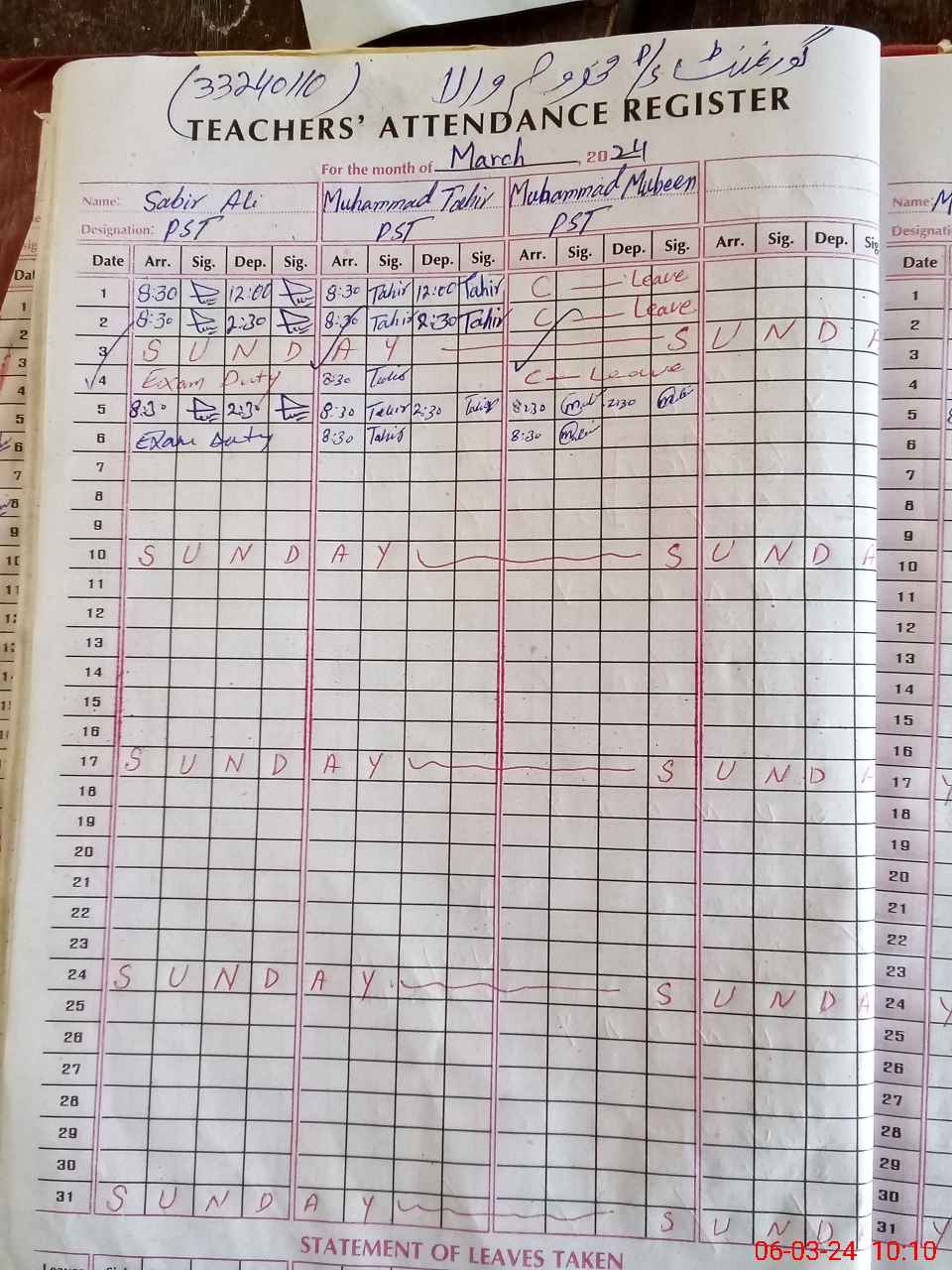 | 33**** | Sa**** Al**** | 1 | 1 | 0 | 0 | 0 | 0 | 0 | 0 | 0 | 0 | 0 | Exam Duty |