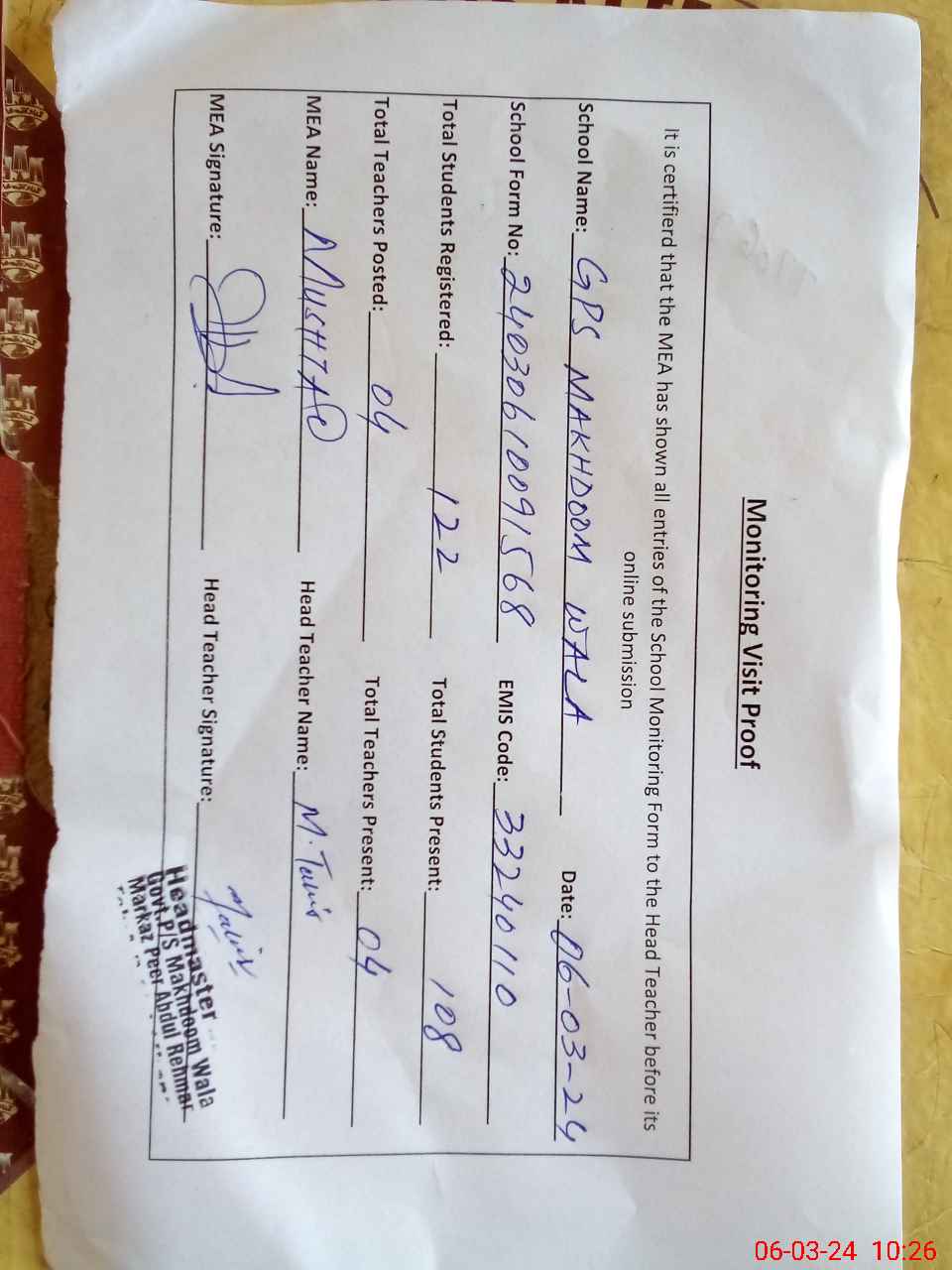 | EMIS Code: 33240110 | Name of School: GPS MAKHDOM WALA | |||