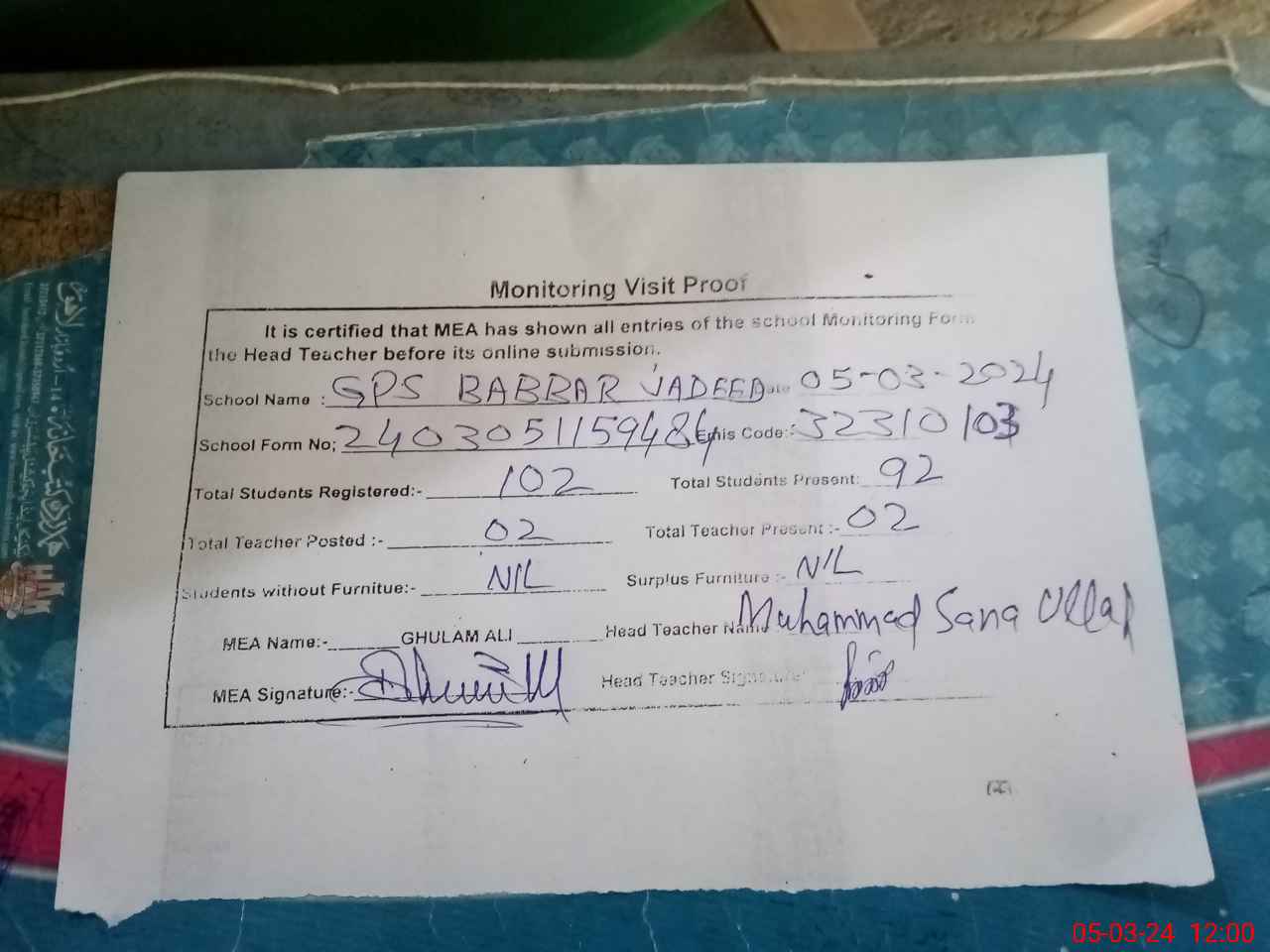 | EMIS Code: 32310103 | Name of School: GPS BABBER JADEED | |||
