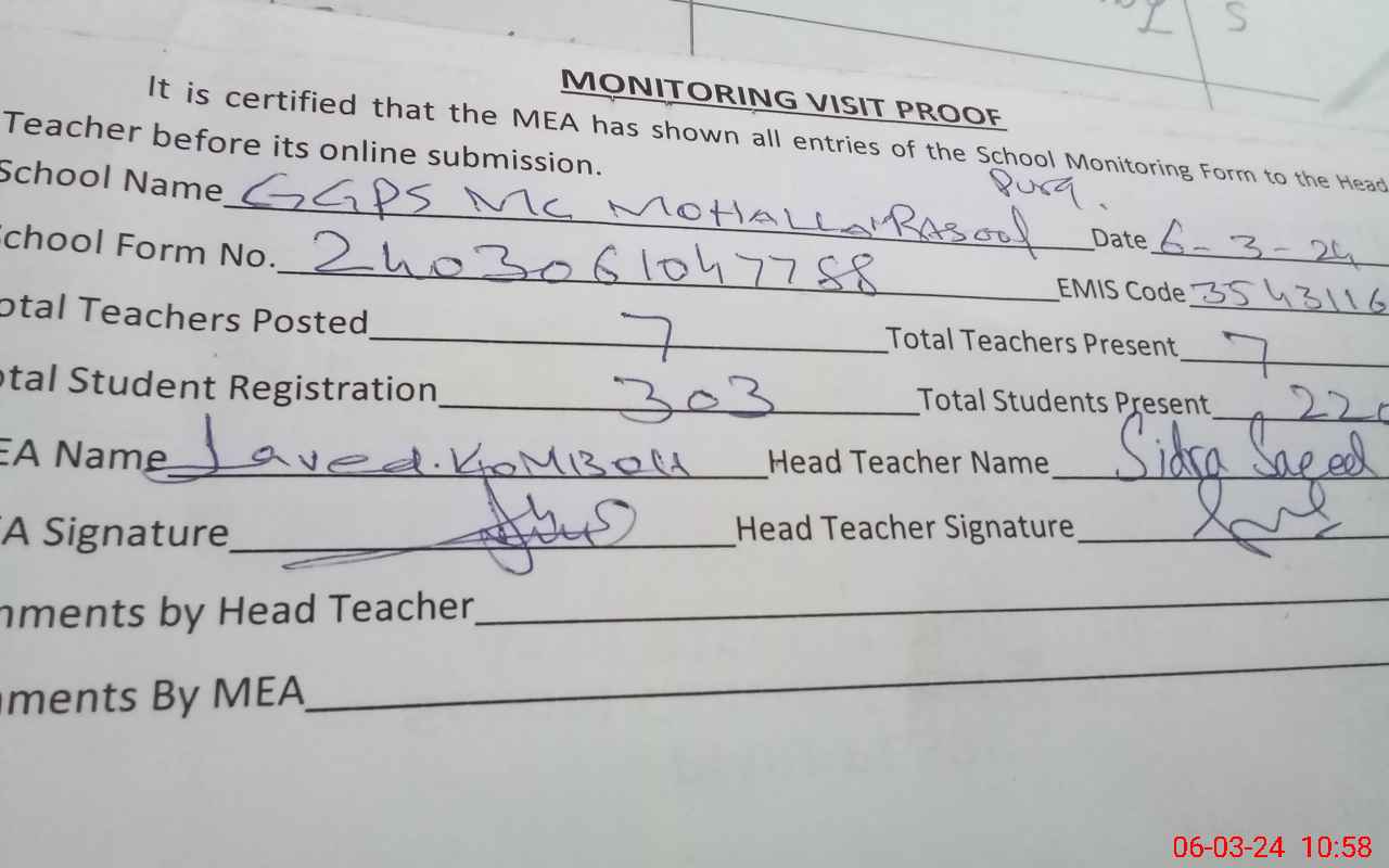| Certified that this School was Inspected by the Undersigned MEA/DMO Today and the Information Stated Above is as Per Record. | |||||