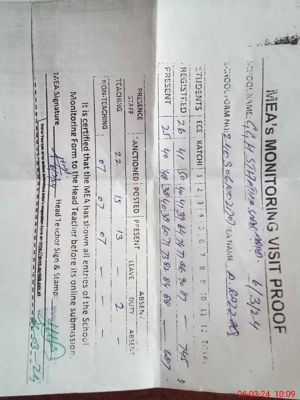 | Attendance Register | Head Teacher | MEA with School | Visit Proof |