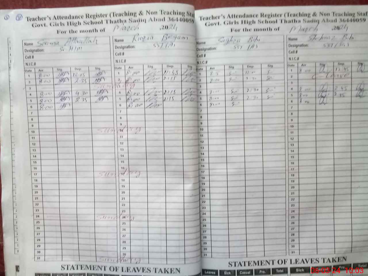 | CNIC | Full Name | Designation | R/C | Absence During Last Calender Month |