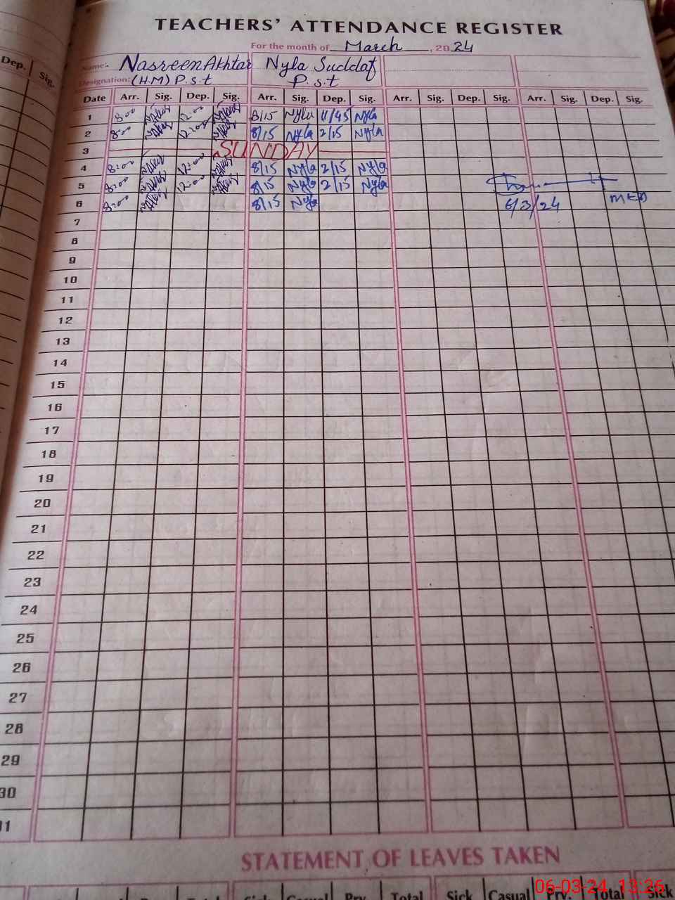 Leave Type | Remarks for today (Leave,Training, Exam,Absent,Late, Other duty) |