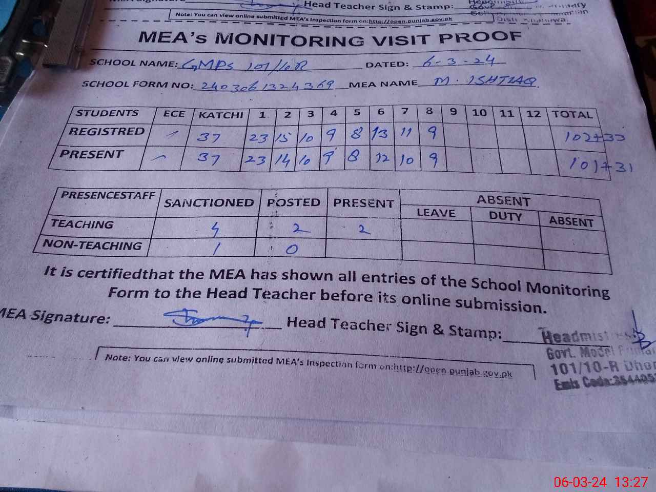 | Attendance Register | Head Teacher | MEA with School | Visit Proof |