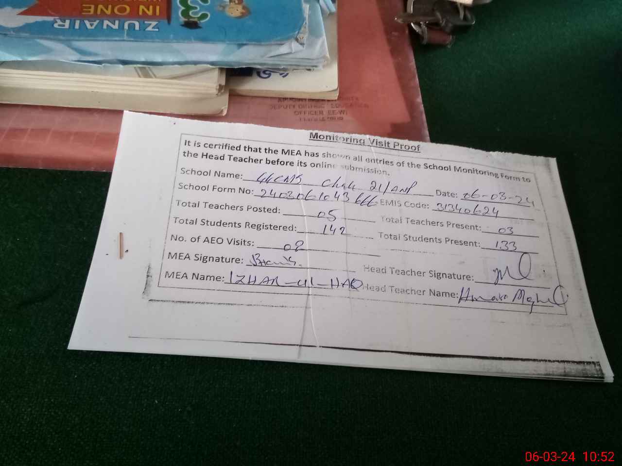 | Attendance Register | Head Teacher | MEA with School | Visit Proof |