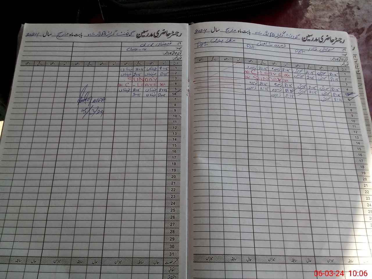 | Total no. of Classrooms: 2 No. of Classrooms Used for Teaching: 2 No. of Classrooms Storing Old Furniture, FTBs, etc: 0Comments if Any: PST Uzma Pervern absent due to leave not approved on SIS and not shown to MEA and also attendance left blank from 14 January 2024 to till date and no any information about Head teacher Ggps Nagshah Shah |