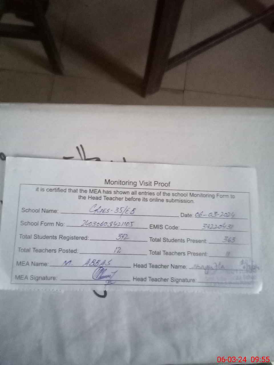 | Attendance Register | Head Teacher | MEA with School | Visit Proof |