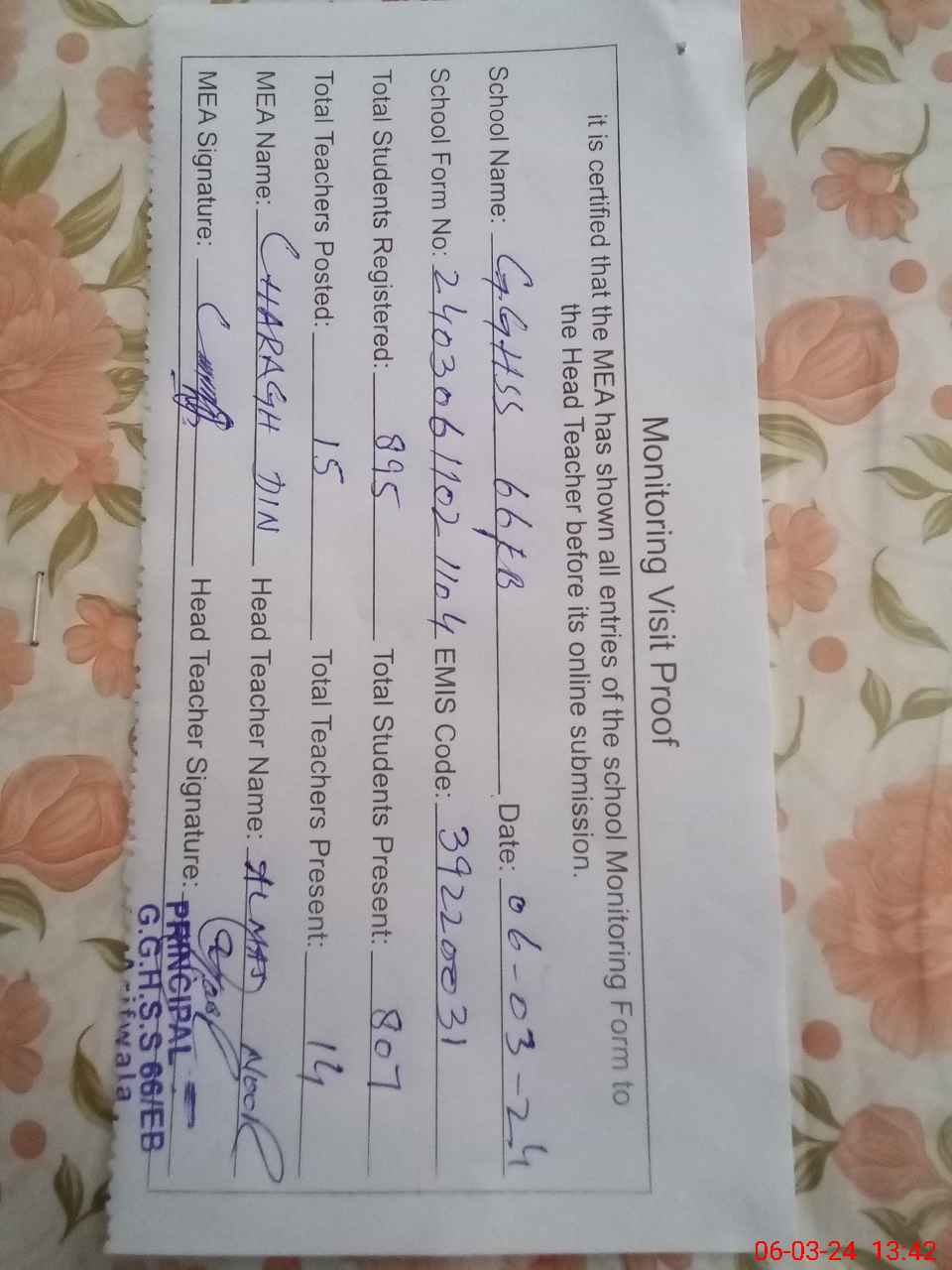 | Certified that this School was Inspected by the Undersigned MEA/DMO Today and the Information Stated Above is as Per Record. | |||||