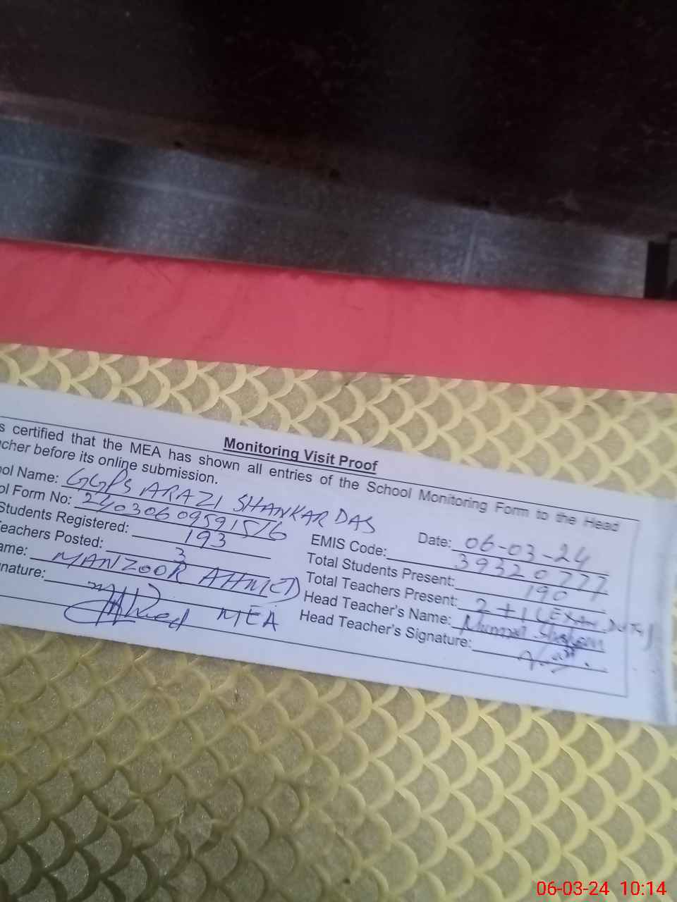 | Certified that this School was Inspected by the Undersigned MEA/DMO Today and the Information Stated Above is as Per Record. | |||||